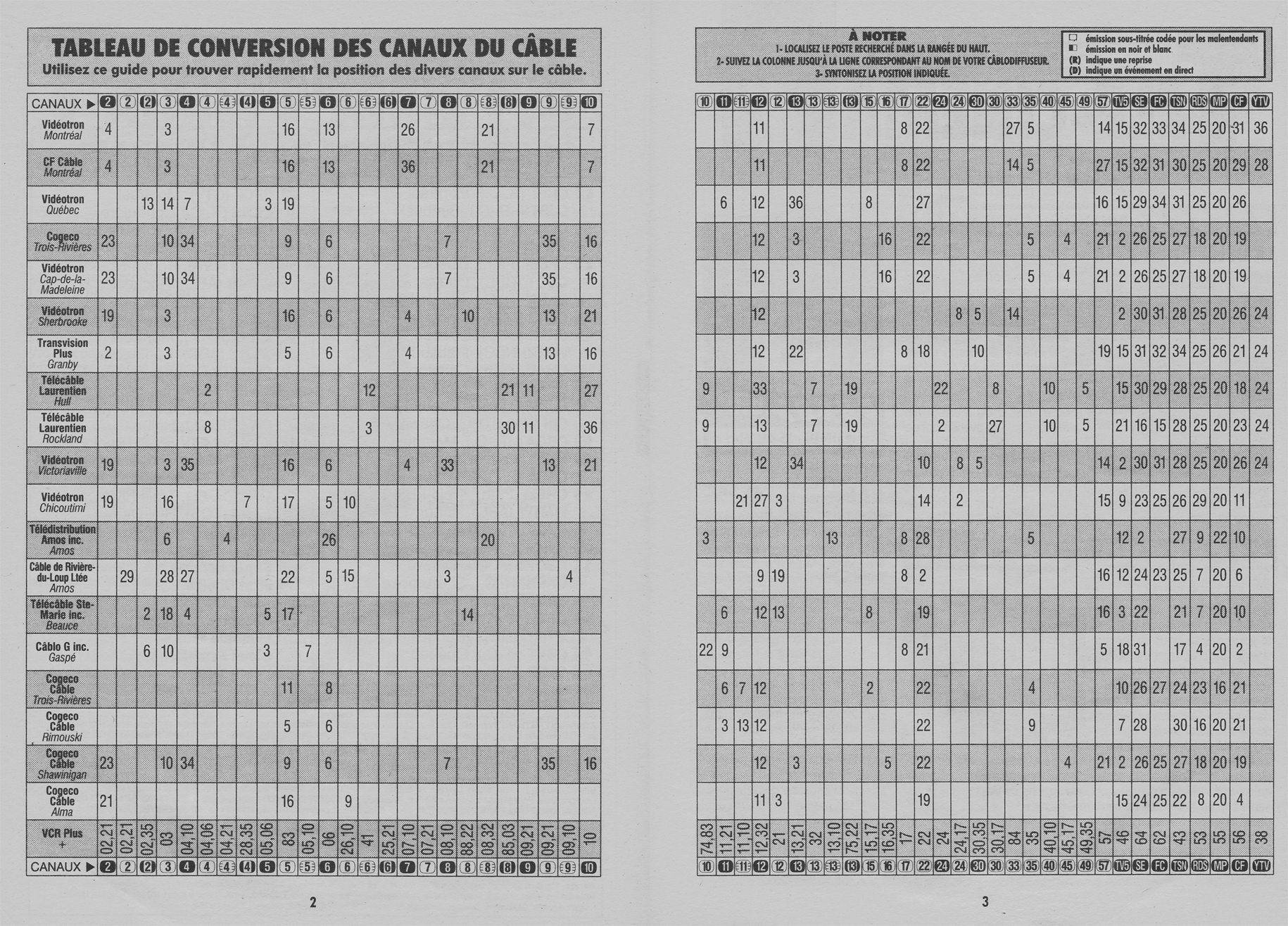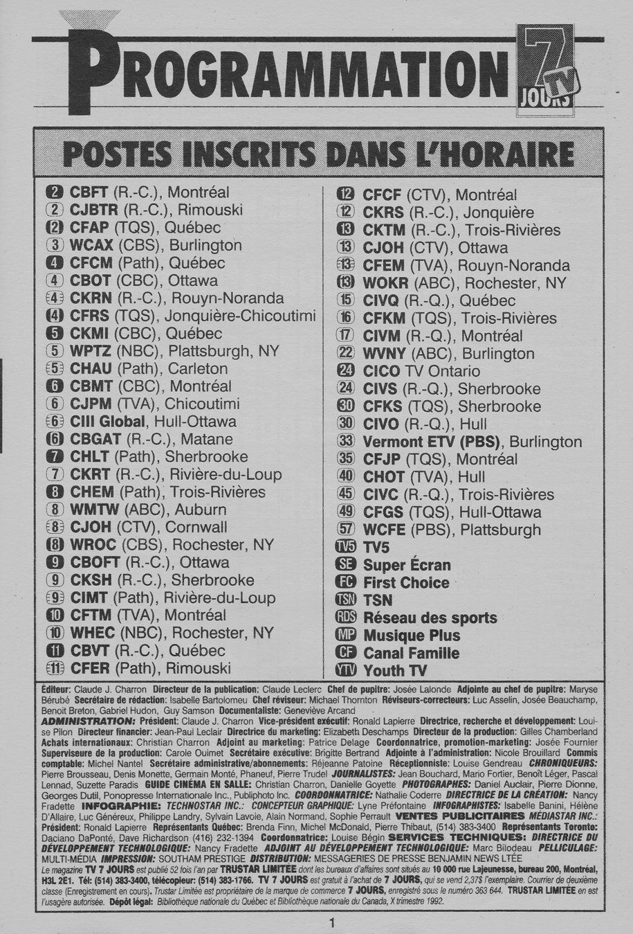 Edition Nationale June 13 1992 Edition Nationale Postes inscrits dans l'horaire Edition Nationale Tableau de Conversion des Canaux du Câble