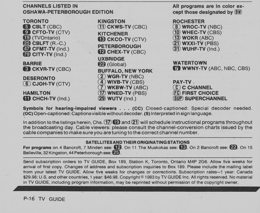 Oshawa-Peterborough Edition February 5 1983 Oshawa-Peterborough Edition Channels Listed Oshawa-Peterborough Edition Basic Cable Guide