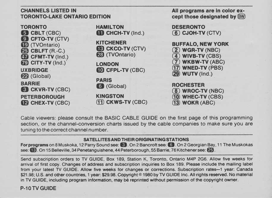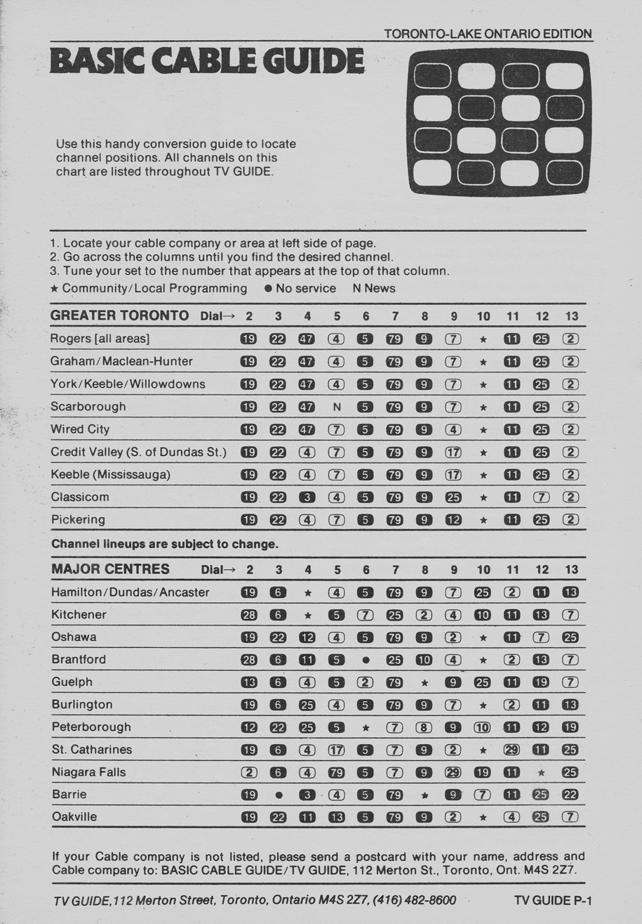 Toronto-Lake Ontario Edition July 5 1980 Toronto-Lake Ontario Edition Channels Listed Toronto-Lake Ontario Edition Basic Cable GuideToronto-Lake Ontario Edition Basic Cable Guide