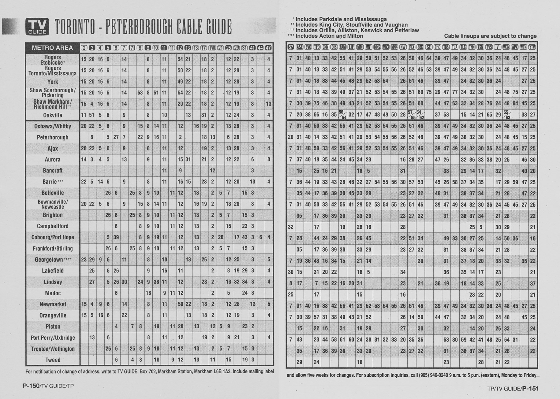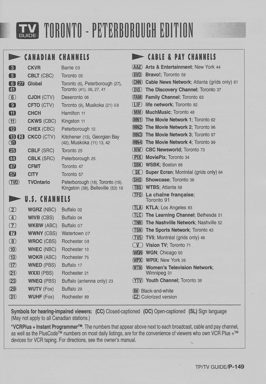 Toronto-Peterborough Edition September 21 1996 Toronto-Peterborough Edition Channels Listed Toronto-Peterborough Edition Channel Guide