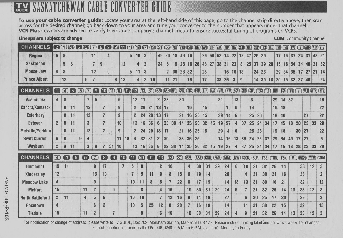 Saskatchewan Edition September 7 1996 Saskatchewan Edition Channels Listed Saskatchewan Edition Cable Converter Guide