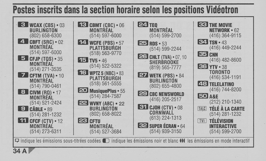 TV Hebdo Édition Métro Câble (Vidéotron Montréal) December 25 1993 TV Hebdo Édition Métro Câble (Vidéotron Montréal) Postes inscrits dans la section horaire selon les position Vidéotron